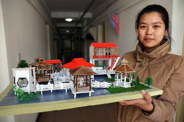 “凌沧水榭”,这个独具古风气息的建筑模型由三位工科女生打造,组员杨茹同学表示创造灵感来源于苏州园林,随着模型慢慢建成,便有了一首以其为主题的藏头诗。