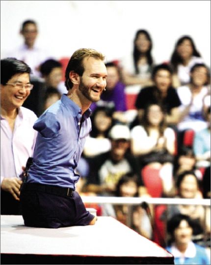 “三个月前一个小男孩看到我的时候觉得非常困惑,他把手背在身后,看看我的身体又看看我的头,看看我的头再看看我的身体,最后他说;‘好吧,至少你还有头。’”尼克对自己的身体并没有感到任何尴尬,他特有的幽默始终贯穿整个演讲过程。