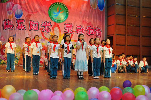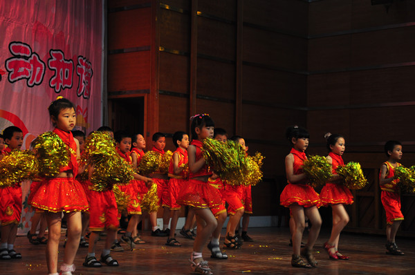 二(1)班的孩子们身着中国红,上演节目《最炫民族风》。谭金燕是该班班长,这个9岁的小姑娘学拉丁舞已经6年了。可爱的孩子们跳起《最炫民族风》有模有样。“这个舞蹈是我们林老师教的,我可喜欢她了。”这群欢乐的孩子口中的“林老师”是我校法学2011级的林诺楠。过去的4周时间里,林诺楠利用午休或没课的时间去给孩子们排练节目,她笑着说,“孩子们跳得的很好,他们开心,我自己也有成就感。”另外,城建学院校外辅导实践部的同学们分别帮孩子们排节目并参与此次文艺演出。