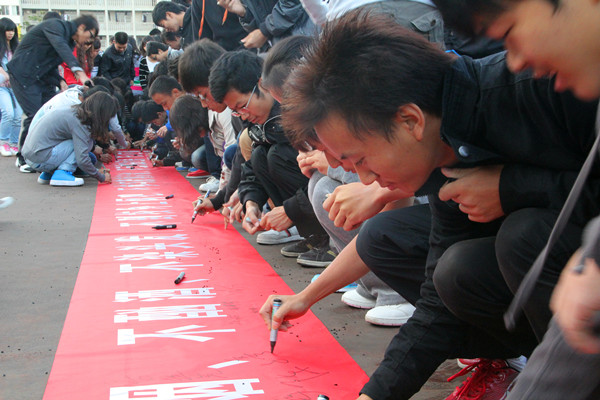 计算机系党总支副书记李雪在致辞中说到,国旗、国歌是祖国的象征,因此这不仅仅是升国旗仪式,也是对广大同学进行爱国教育和集体教育,也是增强凝聚力、向心力的重要形式。同学们在高高飘扬的国旗下宣誓并签名:我是华中科技大学武昌分校的一名学生,面对庄严的国旗,郑重地宣誓,遵守校纪校规,做到不吸烟、不酗酒、不染头发、不沉迷网络游戏、不参与赌博、不在校外租房、不无故夜不归宿。
