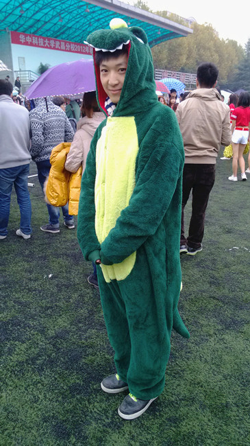 记者了解到,“恐龙先生”是机电与自动学院的一名大二学生,这样装扮是为了给女友加油。据“恐龙先生”的朋友透露,“他女朋友是经济管理学院拉拉队队长,这次穿得这么喜感,专程为女友加油。”