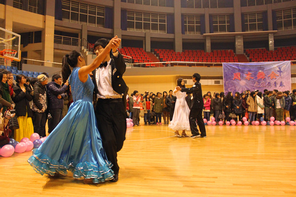 裙裾飞扬,秀发轻拂,西装革履,昂首挺胸。12月14日晚,由校学生会主办的“周末舞会之炫舞青春”华尔兹比赛在体育馆举行。