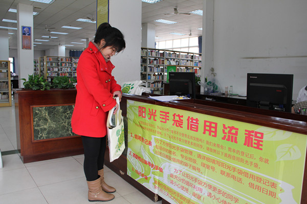 正在图书馆借书的潘同学就说道:“我今天来图书馆借书忘记带书包了,正好看到‘阳光手袋’活动,我就借了一只“阳光手袋”,这只手袋不仅方便适用,而且挺漂亮,还能多次使用。”