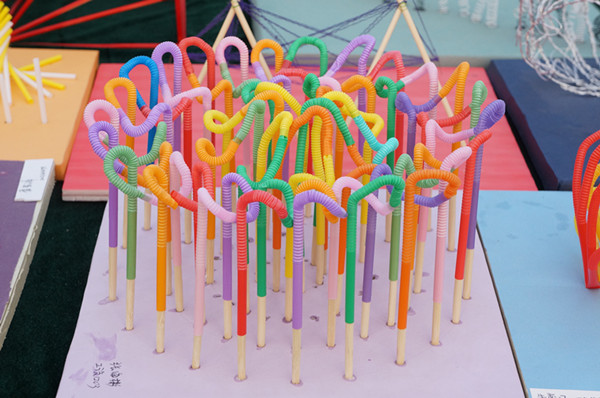 本次成果展持续时间较长,一直从早上九点展出到晚上九点。在光线较好的白天,展示作品以手工艺品为主。有用吸管组成的“挪威的森林”;有的是用石膏材料堆砌成的“希望之塔”;还有用随地捡来的枯木桩装点成的“生命之柱”……总之是应有尽有、件件堪称“奇葩”。