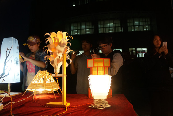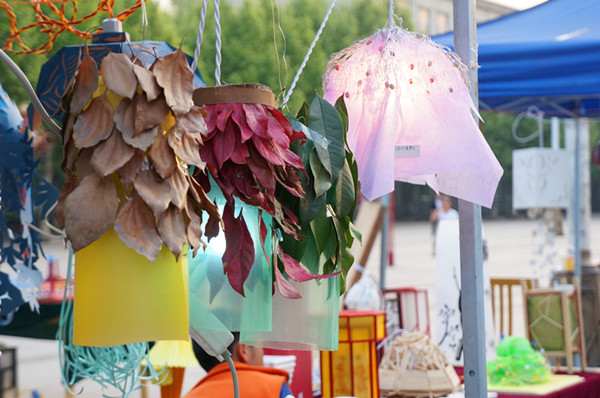 你可千万别以为这次成果展只有这些手工艺品而已,夜幕方至,这个成果展便被同学们自制的创意台灯装点成了一片光的海洋。在会场穿梭而过,大有一种如临元宵灯会一般的感觉。素色镂空的风铃型灯具如一位恬淡自然的隐士,在黑夜中孤芳自赏;粉红色的纸扎百合灯具如一位把酒临风的诗人,醉卧在摇曳的灯光下;用三色树叶拼接的环保灯具,向路人展示着绿黄红三色相互交融的颜色碰撞……