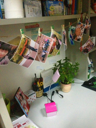 在她的寝室,桌子上,别出心裁地利用一些盆栽的各种小盆子,来装心爱的小物件,形成了一道风景线;挂饰照片墙,是用线和回形针做成的,装入精心选择的生活照,显得更加的别致、新颖;柜子上,摆放着各式各样的瓶瓶罐罐,里面放的是调料和茶叶,据她介绍,那是她自己给自己做的绿色食品。