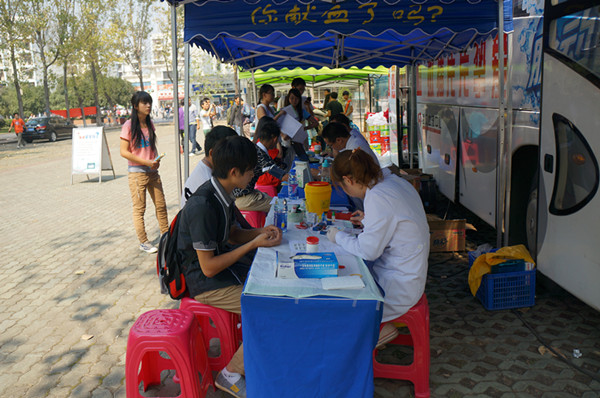 “一滴热血,一份关爱。”10月14日,由武汉市血液中心举办的“无偿献血高校行”活动在西区停车场举办。