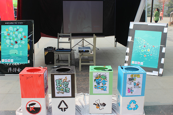 活动现场设置了红、黑、蓝、绿四色“垃圾桶”,全部为艺术设计学院的同学们手工制作。工作人员在现场派发日常环保问题的调查问卷。答卷者认真答卷后,再将其投入手工“垃圾桶”,然后用记号笔在桶外壁上签下自己的名字。不一会,桶壁上便留下了众多环保支持者的名字。