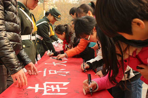 在签名期间,国旗班在一旁认真地回应每一个同学的问题。国旗班副班长石珊珊说:“每一个特别的纪念日,我们都会举行升旗仪式。今天,我们全套军装,升国旗,还有同学进行了国旗下的发言。”