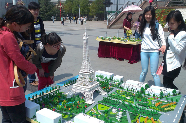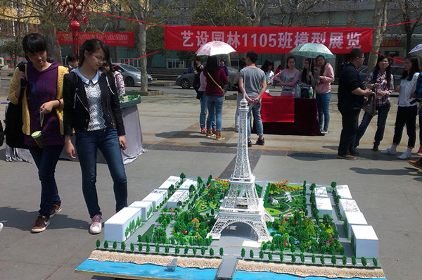 花草树木点缀着的埃菲尔铁塔,层层台阶指引着的水利核能总部……3月27日中午,艺术设计学院园林1105班的绿地景观模型展览在中区广场展出。