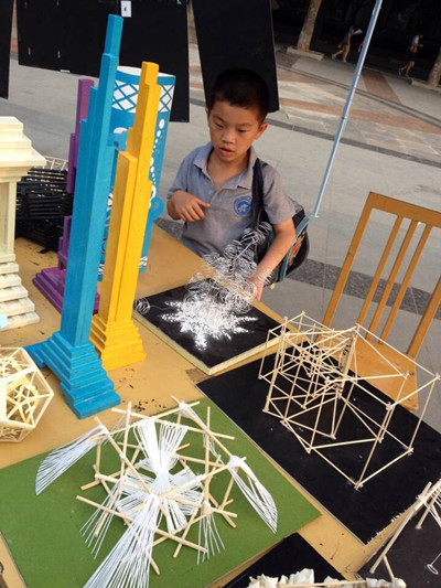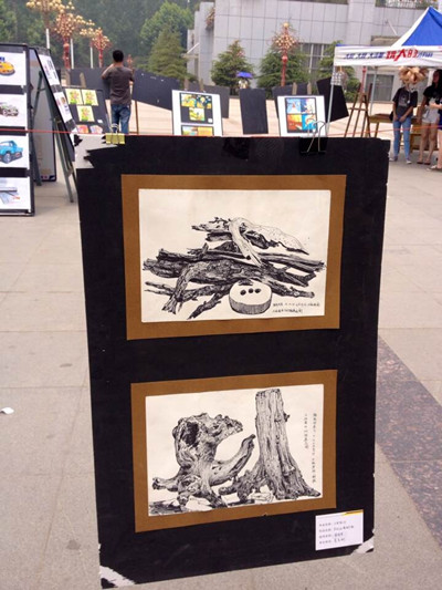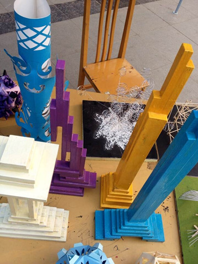 淡墨勾勒的太行山采风写意画、色彩自下而上由深浅渐变的蓝色波浪条、网状明艳的红心、高楼般矗立的柱状模型……6月11日中午,产设专业大一至大三同学的精致创意作品在中区广场陈列于同学们眼前,吸引了不少人的眼球,路过的小朋友都忍不住伸出手去小心翼翼触摸其中一个柱状模型的身躯,并惊叹:“好漂亮!”