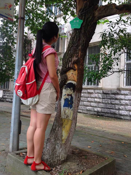 盛夏,校园树影婆娑。近日,新闻12级鲁同学惊奇发现新法院办楼后一棵香樟的粗糙树干上探出了一片绿叶般巴掌大小五角名片,宛如树语低吟:香樟;Cinnamomumcamphora;樟科;樟属。落款赫然是艺设园林1206班。此外,杨树、银杏……11号教学楼到西九宿舍楼之间、自主学习中心附近的林荫道旁,不少树木都被挂上了名片。