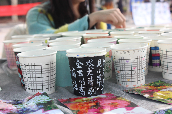 绘制着各式图案的纸杯吸引了不少好奇的同学前来询问。这些外观精美的纸杯中已装满了泥土,只需种下附赠的花种,每日浇水,过一段时间就能开出花朵,现场共有8种花的种子供挑选。这些纸杯植物没有固定价格,购买的同学全凭个人意愿付款。活动负责人李文介绍道,从上周三起,班上的同学便开始在纸杯上设计作画,共绘制了80个纸杯。活动所得将全部用于捐赠。