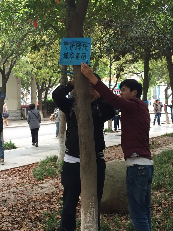 电气1403班的同学们制作了五颜六色的小纸板,每个纸板上都写着环保的标语,如“环境你爱,美景常在;用眼触目,用心感受”……随后同学们一起动手,将标语牌系在校内各处的树上。大家一起动手,既为保护环境,又能增强班级的凝聚力。