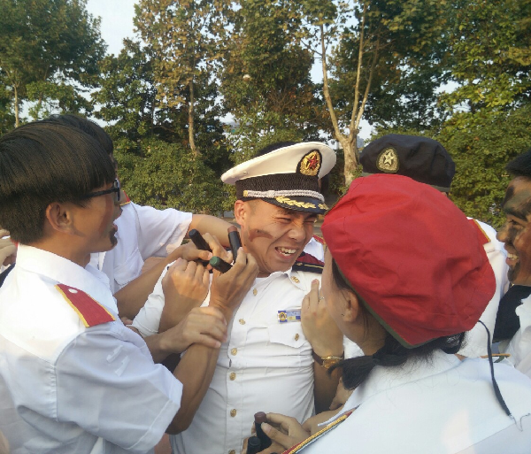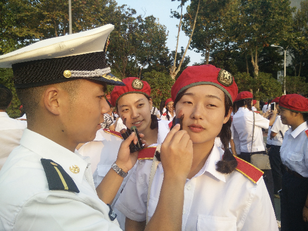 “快看快看,一排排女兵头上扎着双马尾辫,如同铿锵玫瑰;一列列男兵脸上涂着迷彩色,尽显铁汉阳刚。特殊装扮的方队大步向师生们走来。”9月22日,在2015级新生军训阅兵仪式上,五营三连方队的特殊装扮惊艳全场。