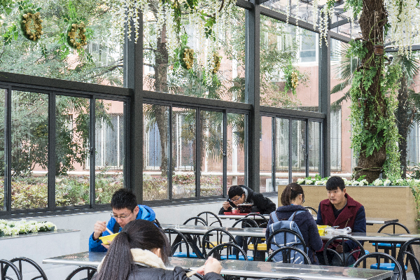 餐厅在建造时最大程度的保存原始绿化环境,餐厅原址有4棵大树全部保留,在屋顶上留出可以让大树自由生长的空间。餐厅还采用全透明设计,学生不仅可以在大树旁进餐,还能透过窗户看到周围小树林的景致。