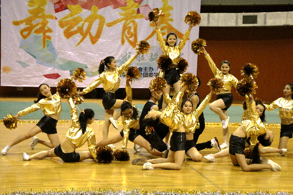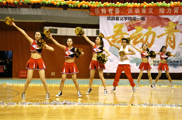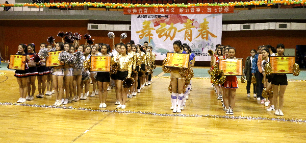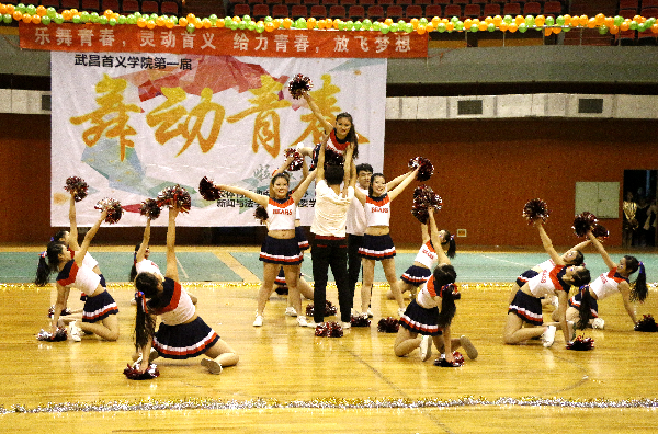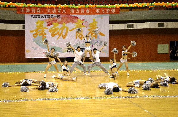 青春舞动校园,健身操跳出活力。12月17日晚7时,由校体育运动委员会主办、新法院分团委学生会承办的武昌首义学院首届啦啦操大赛在体育馆隆重举行。新法院党总支副书记吴世杰,机电院党总支副书记陈佃生,艺设院分团委书记周红丽出席活动。基础课部肖艳芬、尚谭伟、庄静、张卉、祝杨五位老师担任评委。汉口学院、武汉东湖学院、文华学院代表前来观赛。
