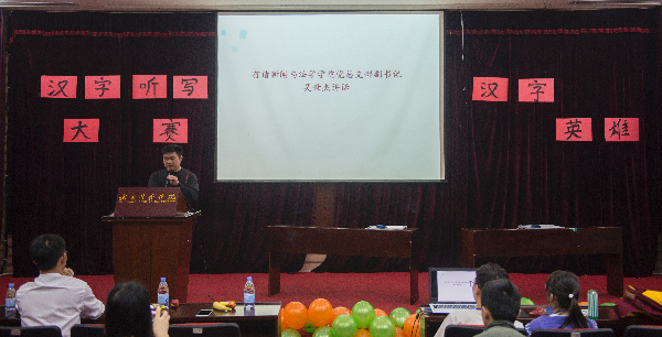 党总支副书记吴世杰发表讲话。他说,汉字听写大赛事是展示文化底蕴、展示选手风采的平台,有利于加强爱国主义建设、弘扬中国传统文化。希望同学们能在日常生活中规范用字,用好中国人的文字,并预祝选手们取得好成绩。