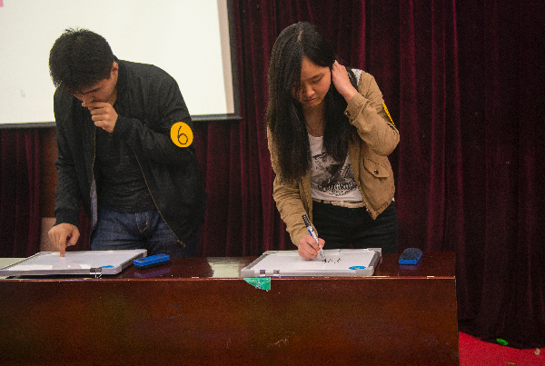 决赛分为分组轮战和同步听写两个环节,分别考察选手对字音字形、成语易错字的掌握程度。“扣盘扪烛”、“碔砆混玉”等高难度成语没有令选手们望而生畏,反而被他们各个击破。观众们时而为选手的精彩表现拍案叫绝,时而为被淘汰的选手扼腕叹息。经过一个半小时的激烈角逐,最终法学1301班刘博良摘得桂冠,第二、第三名分别由汉语言文学1502周晓萌和法学1301班高艺坤斩获。