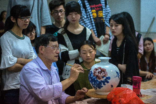 用画笔蘸一些暗红色的颜料,在素白瓷瓶上轻轻一抹,再用食指巧妙地晕染开,如此反复,一朵国色天香的牡丹就栩栩如生地绽放在了同学们眼前。5月18日晚,在艺术设计学院陶艺室开展的名为《陶瓷艺术装饰与设计》的主题讲座上,中国高级工艺美术师、景德镇国贸陶瓷大市场业主委员会主任刘仁祥向同学们展示了精湛的陶瓷绘画技艺。