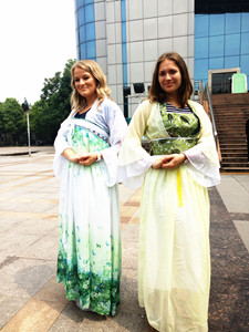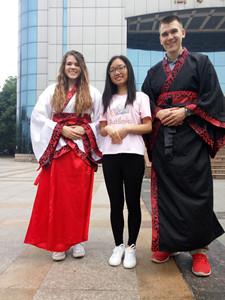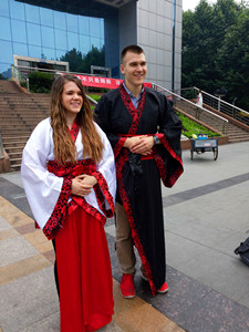 他们走到展示汉服的帐篷前就挪不开步了,眼睛被飘逸灵动的汉服魅力深深吸引。看到他们跃跃欲试的样子,国学社的同学们有礼貌地邀请他们试穿汉服,国学社社长刘静雯也热情地教他们行“万福礼”、 “揖礼”。美国大学生马上进入到“鞠深园,拜恭敬”,“拱手高举,埋头于臂弯”的氛围中。面对此情此景,爱荷华领队Paul即兴朗诵出“岁暮阴阳催短景,天涯霜雪霁寒宵”的诗句。一位外国人能如此熟练地吟出杜甫的《阁夜》,获得在场师生的一片掌声。