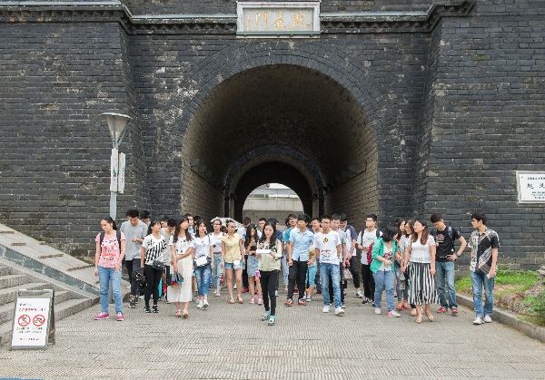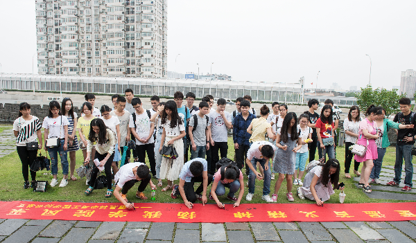 沐浴革命光辉,感受先烈情怀。大家在微雨中集体参观了中和门瓮城遗址、起义军使用过的大炮复制品、先烈题写的文章等。随后,学生党员黄宗兴带领全体学生党员在中和门前宣誓。2013-2014级学生党支部党员代表檀玉茹发表感言:“辛亥革命推翻了清朝的专制统治,挽救民族危亡,争取国家的独立、民主和富强。革命结束了中国长达两千年之久的君主专制制度,是一次伟大的革命运动。我们青年党员要永远牢记!”最后,师生纷纷在横幅上签名,并在中和门前合影留念。