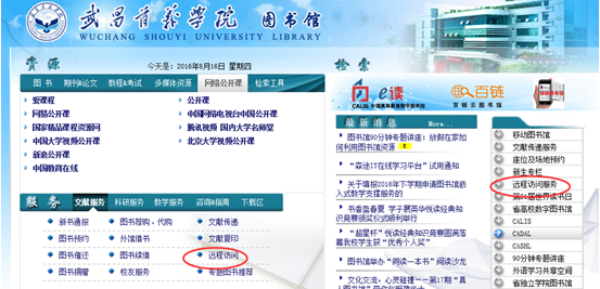 图书馆相关负责人告诉记者,读者只要进入武昌首义学院图书馆主页http://www.lib.wsyu.edu.cn/,找到“远程访问服务”。如下图: