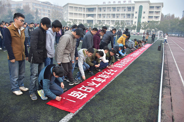 随后,同学们按照班级的顺序依次在“七不”横幅上签名。