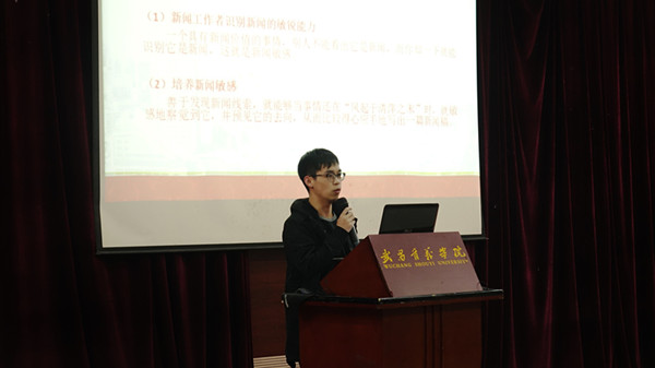 12月2日晚,校大学生新闻中心新闻业务培训课在11-106开课!首次课程特别邀请了湖北日报传媒集团青春网主编、校报记者团原团长、2010届新闻专业毕业生杨成主讲“校园新闻的发现与写作”。校报副总编丁炜刚出席活动,大学生新闻中心近200名学生记者参加培训。