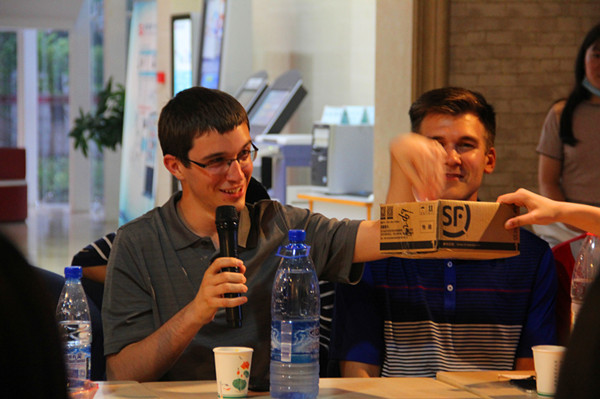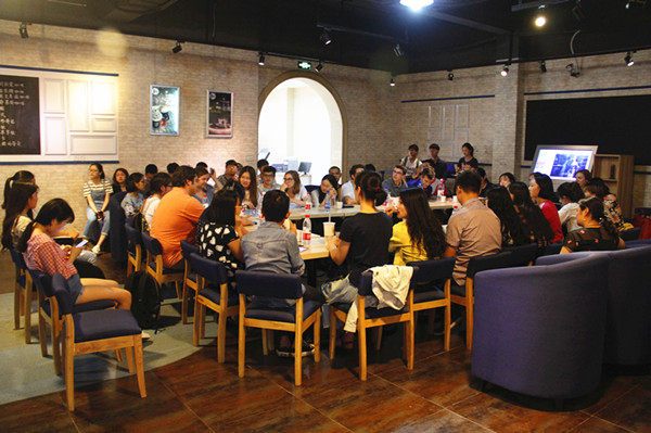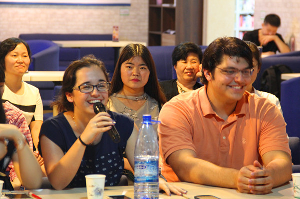 交流会由爱荷华大学的Emily主持。开场,大家分别用五个单词,从性格、外貌等方面形容自己,互相认识。接着进行词语接龙游戏,输的人会有相应的惩罚,气氛瞬间活跃,同学们都绞尽脑汁接上单词。第三个环节是同学们提出自己想提的问题,爱荷华的朋友们依次回答。同学们争先恐后提出自己的问题,问题涉及上课、美食、出国、婚姻等,甚至还有同学提到了中国的高考,爱荷华的朋友们也一一认真回答。前来旁听的老师们也提出了自己的问题,张立老师针对同样学习语言教育的Emmy提出了在教学上的问题,陈磊老师问Emmy还有没有研究过其他国家的语言,Emmy都一一作答。而接下来的游戏是在场同学抽签回答问题,第一个抽签的女生唱出一首“Five Hundred Miles”赢得一片掌声;Eric用中文回答最喜欢的中国菜“松鼠桂鱼”让大家敬佩不已。交流会最后大家分小组自由交流。