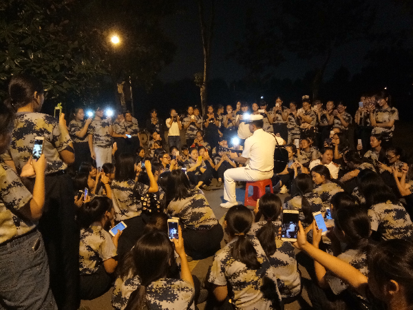 现场氛围高涨,百余名新生围绕在教官身旁,有的人偷偷抹着眼泪,有的人拿起手机录像。教官弹起吉他,新生轻轻哼唱,配合默契,一首《喜欢你》唱完还嫌不够,又唱起周杰伦的《彩虹》,浪漫而又温馨,吸引了众多路人围观。