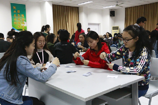 比赛项目为“力争上游”,18名进入决赛的同学被随机分为5组,每组取前两名晋级。选手打出印有“应收账款”、“银行存款”等会计科目的扑克牌,打出的每一手牌都必须满足会计账务处理中的借贷平衡,并且要说出与之对应的经济业务,跑得快即手上留牌最少者胜。