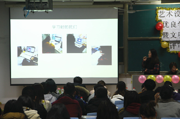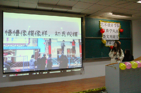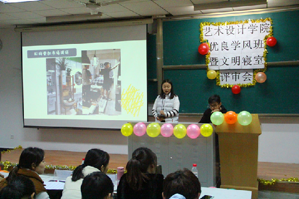 参加此次优良学风班评选的有7个班,参加文明寝室评选的有4个寝室,参选班级和寝室代表各作5分钟PPT展示讲演,院党总支副书记杨琳、分团委书记韩峰及其他老师代表、学生代表担任评审。经过长达1个多小时的现场PPT展示和讲演,评选出优良学风班和文明寝室。