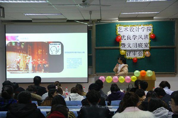 11月26日晚,艺术设计学院2016-2017年度优良学风班暨文明寝室评审结束,风景园林1602班、视传1602班、视传1502班获“优秀学风班”称号,西2434寝室、707寝室、南13726寝室获“文明寝室”称号。院分团委书记韩峰在总结讲话中,对获奖班级和寝室表示祝贺,并勉励学院众学子向“双优”看齐。