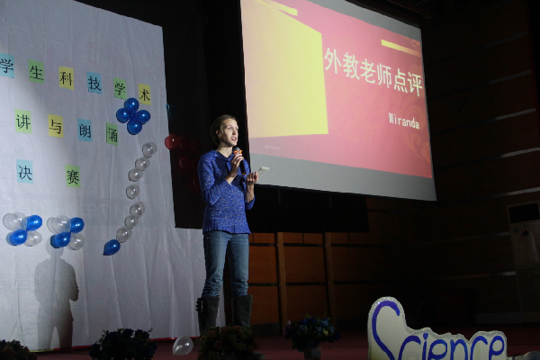 炫目的灯光下,两位主持人走上舞台,比赛正式开始。朗诵组英语专业的洪可杨、陈思佳、操琼在朗诵完歌词《young and beautiful》后现场清唱了一段,婉转动听的歌唱使得现场掀起一阵又一阵的掌声和欢呼声。针对选手们流利的口语和标准的发音,外国语学院外教Miss Kristen给予了高度的评价,并且表达了她对各位选手的喜爱与支持。