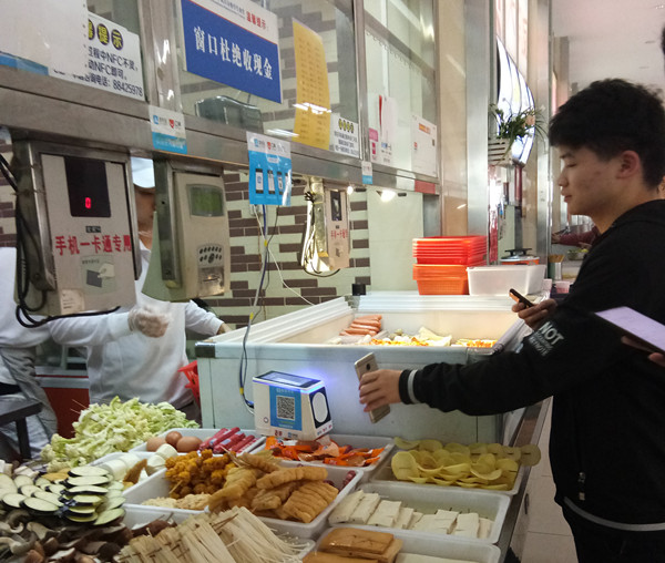 据了解,扫码机支付只需卖家手动设置付款金额,顾客将手机支付宝付款码打开,对准扫码机的扫描区,再由卖家手动确认,就能完成整个支付过程。这样的支付方式大大提高了支付效率,尤其是用餐高峰期,更能节省学生就餐时间。