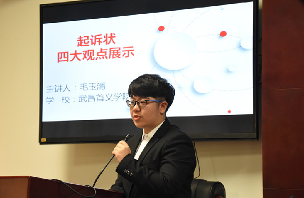 我校两名学生参赛,初赛阶段,毛玉清撰写的起诉状和辩护词、2014级法学专业学生向常梅撰写的律师函和辩护词进入复赛,文书双双荣获优秀法律文书。复赛中,毛玉清撰写的起诉状文书进入决赛。决赛阶段,毛玉清精心准备法律文书PPT,与武汉大学、中南财大等校学子同台角逐,在6分钟内,从“诉讼参与人、诉求和案由、赔偿损失以及管辖法院”四个部分分析案例,清晰地讲解了自己的诉讼思路。