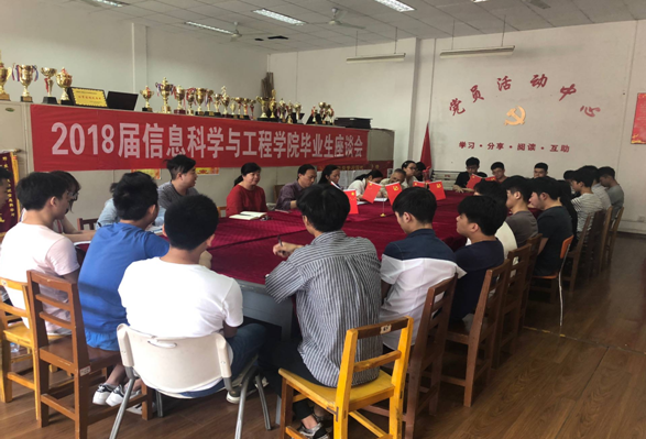 5月9日,信息科学与工程学院召开2018届毕业生座谈会。副院长王育勤,党总支副书记赵瑜,分团委书记汪晓航,各系主任,毕业班辅导员,教师代表和优秀毕业生代表参加。汪晓航主持。