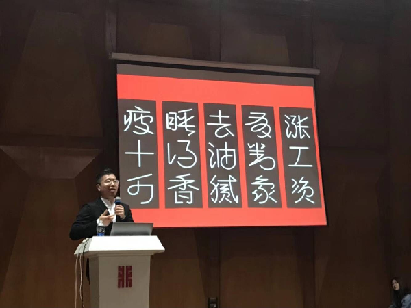 陈楠老师致力于中国传统文化与当代设计的融合,首倡“格律设计论”,提出“格物致知行合一”的设计理念,推动设计哲学与研究型设计教学与实践。著述二十余部、论文数十篇,是中国古文字艺术设计研究者,首款甲骨文设计字库、章草设计字库设计者。讲座中,陈楠老师以他多年来对设计哲学、设计思维与方法的研究心得,并辅之以对独特汉字艺术设计史观的诠释与解读,以及在系统理论指导下所创作的汉字创意设计实践作品而展开。