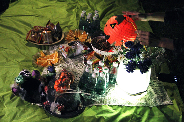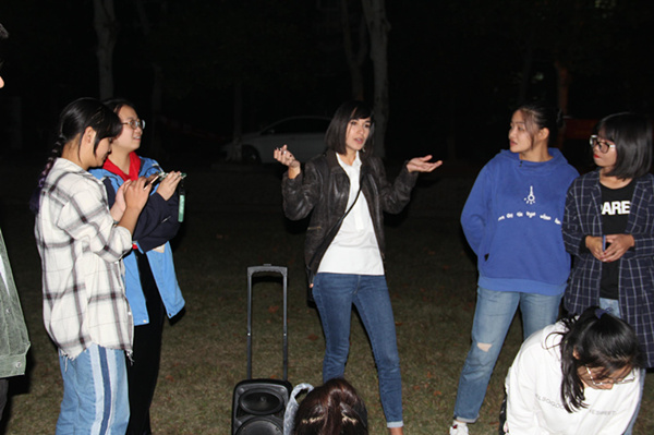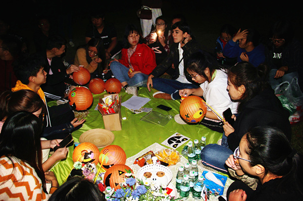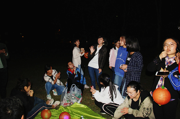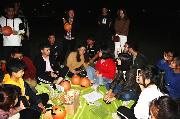 10月29日晚,11栋教学楼前草坪上正在进行的万圣节乐趣活动引来不少同学围观。来自意大利的美女外教Seleliadis Giorgia与同学们席台而坐,围绕“万圣节”热烈交谈着。国际教育学院李孟阳和曹文婷两位老师,国际交流协会与English Only口语协会的同学们参加了活动。