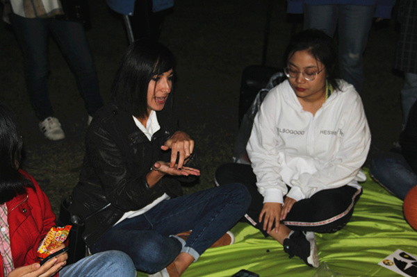 同学们与Seleliadis Giorgia认识后,活动正式开始。所有老师和同学们席地而坐,每个人手握南瓜灯,灯光随着音乐的律动而闪烁。Giorgia用英语和中文切换着为同学们讲述南瓜灯的来源以及西方国家的万圣节活动、普及意大利的一些文化节日,比如意大利没有万圣节,却有类似于中国的清明节。她还和同学们分享外国电影,一起用英文讲鬼故事,用英文介绍武汉……谈论中,Seleliadis Giorgia不经意间教授大家一些有关万圣节的"高频词汇",让大家能在活动中练习口语。