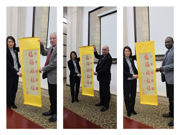 最后,三校代表互赠本校标志礼品,并合影留念。