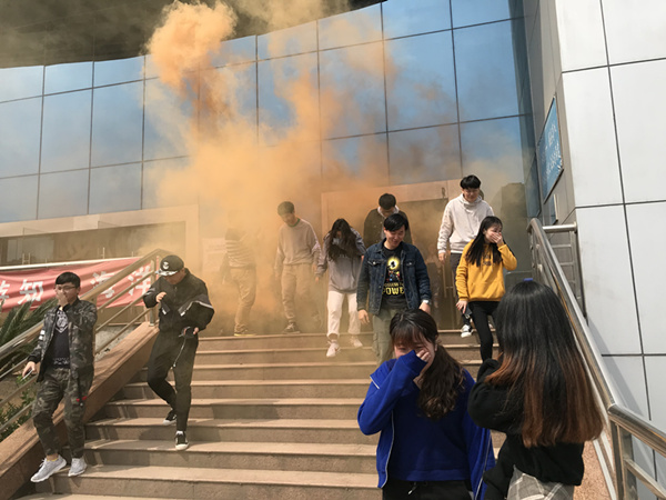2点整,中区分馆内烟雾弥漫,火灾报警器急促响起。图书馆工作人员闻讯立即组织馆内学生从各安全通道疏散至安全区域。3分钟后,所有人员全部安全撤离。