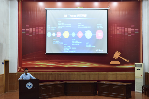 培训活动分为上下两场,上午针对RT-Thread及其应用教程进行介绍,下午进行实战训练。活动开始前,Linux用户协会指导老师徐斌首先对RT-Thread的市场需求做了简单介绍。他表示,在物联网操作系统越来越广泛发展的今天,一款自主研发的高质量的强大的IoT OS(物联网操作系统)甚至关系到国家的安全。RT-Thread自2006年发布以来已走过13个年头,拥有全国最大的嵌入式开源社区,并广泛地应用于能源、车载、医疗、消费电子等多个行业,累计装机量超过亿台,成为国内自主研发最成熟稳定及装机量最大的开源IoT OS。