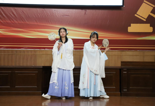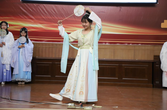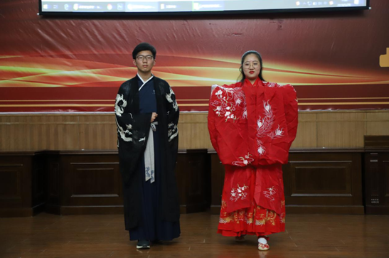主讲人、财管1801班娄荧身着对襟齐腰襦裙,外披红色大袖,眉心一朵莲花显得格外清丽。她从什么是汉服、汉服的起源发展、汉服的基本款式、汉服的消亡与复兴几个板块做了详细讲解。为了让现场同学更直观的感受汉服的魅力,忆回汉服社的社员们带来了精彩的“汉服秀”表演。裙裾飘飘,步步生莲,伴着古典音乐,社员们身着不同款式、颜色、朝代的汉服,如襦裙、袄裙、曳撒等,辅以伞、剑、手帕、蒲扇等道具,唯美地展示了古代女子的走路姿势以及形态礼仪。