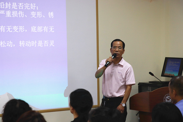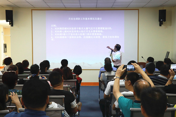黄银章老师为兼职消防员讲授基础培训课。他由浅入深,从最基础的火警报警,初期灭火,保护火灾现场切入,逐步深入到消防器械的日常维护,各教学职能区域如何预防火灾,学生宿舍存在哪些常见的安全隐患等问题。实用的培训内容让参训人员深有感触,纷纷拍照,将讲课内容拍下来以作留存。