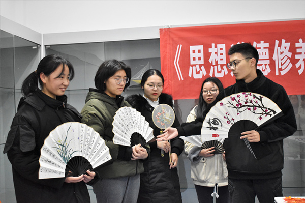 亘越古韵,回望经典。外语1905班曾一帆组,运用太空泥参照网络资料耗时半个月打磨仿制了铜钺、汉蒜头口素瓶、商“丹”青铜卣、铜甗、铜觚、铜方鉴 、铜戈、铜浅腹圆盘豆等青铜器。曾一帆表示,从这些青铜能看出古人的生活习惯,知晓古人的风俗,以物知人、知事。在制作过程中,我们主动学习了解了我国的文化瑰宝,知晓中国历史的沧桑变迁,充分认识文化传承的重大意义。会计1902班倪小碟用齐针在团扇上绣出了毛主席诗句《沁园春•雪》,意在表明江山繁华昌盛;而用长短针绣出了梅花,梅有傲骨,意为国人之傲骨。“江山如此多娇,引无数英雄竞折腰。”一句与梅傲雪霜相呼应,表现了中国少年为国昂然挺立,奋发进取的姿态。