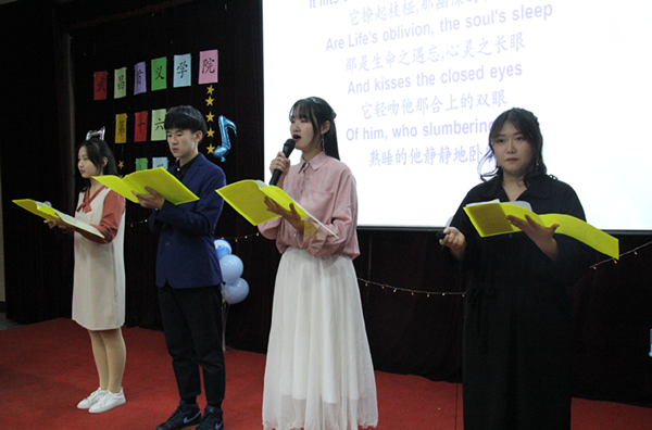 经过激烈角逐,英专组陈康、谭晶、谢飘、张颖组和非英专组贺伊琳、尹乐甜、吴翰文、郭月娥组获朗诵赛一等奖,英专组肖瑶瑞智和非英专组马佳辰、吴丹妮获演讲赛一等奖。