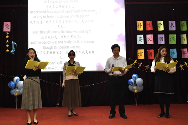 为营造浓厚的英语学习氛围,提高大学生英语应用能力,丰富校园文化,近日,由校团委主办,外国语学院分团委承办的“第十六届大学生科技学术节”之英文朗诵与演讲大赛总决赛于11栋教学楼106顺利举行。