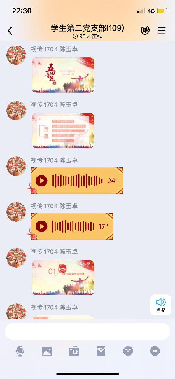 5月15日下午,艺术设计学院第二学生党支部书记段舜婕老师组织学生党员,通过QQ群学习习近平总书记“五四百年”青春寄语,激励广大青年学子深刻领会五四运动历史意义和五四精神时代价值,把五四精神、民族精神和时代精神统一起来,以实际行动诠释新时代青年担当。